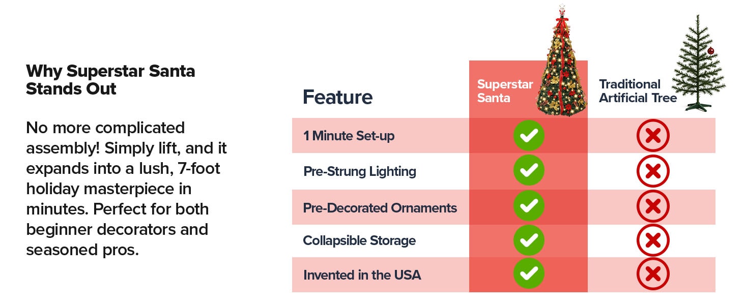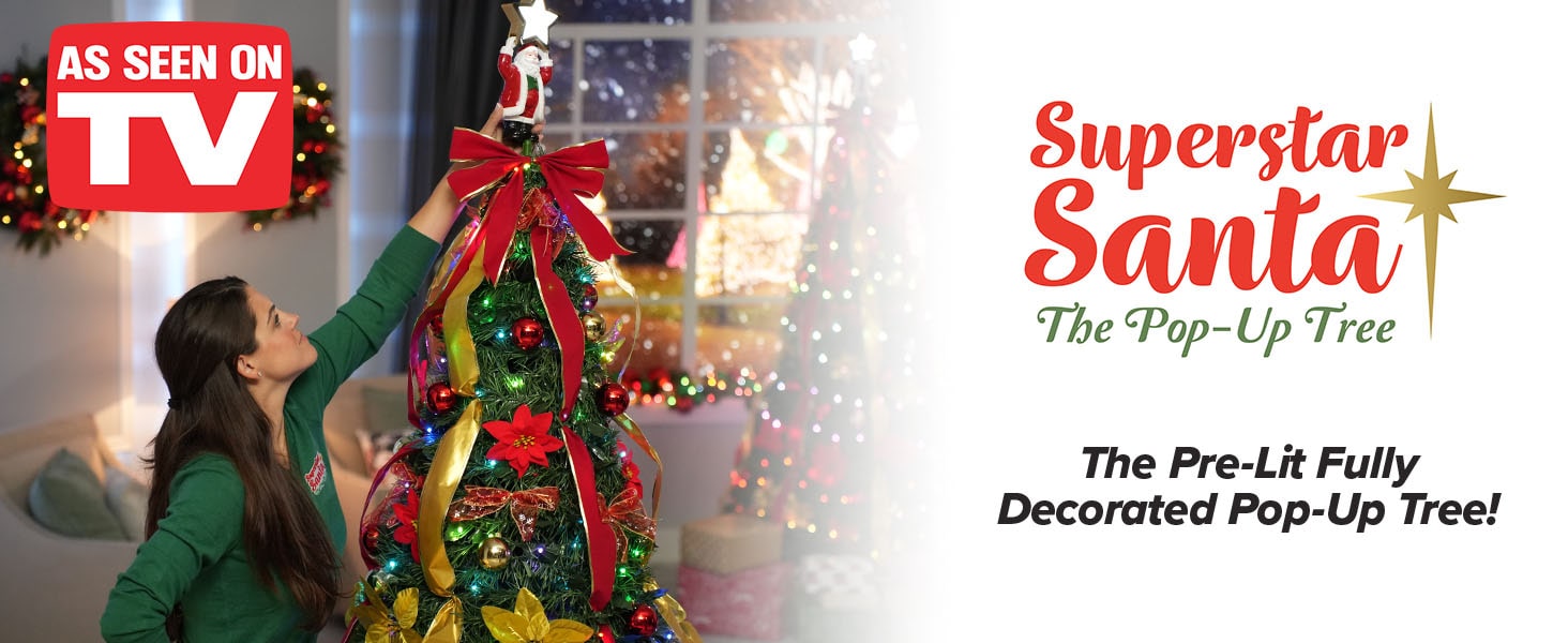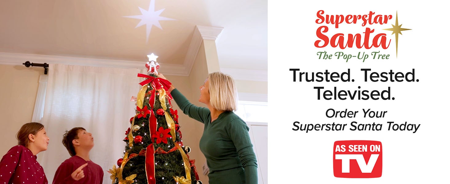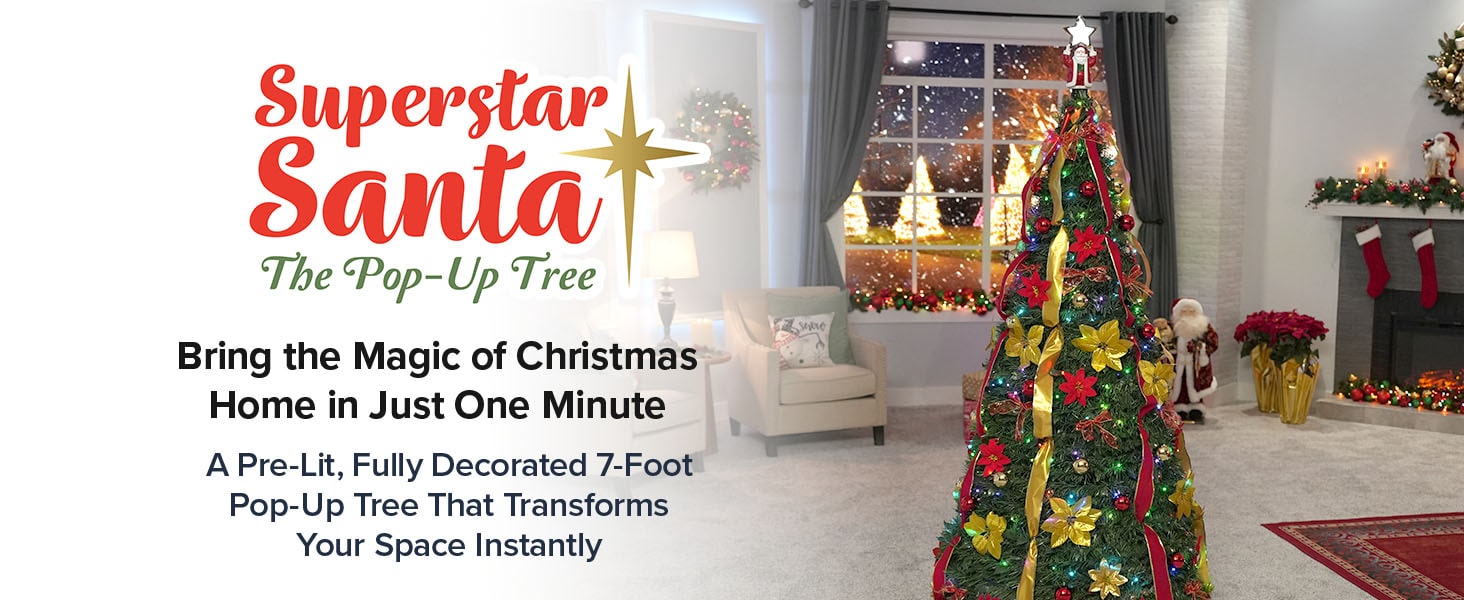 Bring the magic of the holidays home with the Superstar Santa Christmas Tree, the ultimate holiday centerpiece that combines ease, elegance, and charm. Standing majestically at 7 feet tall, including its one-of-a-kind Santa topper, this tree features an innovative light projector that casts a radiant North Star onto your ceiling, creating a dazzling focal point for any festive space. It’s fully decorated with stunning ornaments, festive bows, and elegant ribbons, and pre-lit with 200 adjustable LED lights that offer 32 lighting modes, all controlled effortlessly via remote. Setup is a breeze—simply lift, and it transforms into a lush, holiday-ready masterpiece in minutes, making it perfect for both first-time and seasoned decorators. After the festivities, it folds flat into its included storage bag for easy, space-saving storage. Durable and long-lasting, this tree is designed to withstand years of celebrations. Even though it comes beautifully decorated, there’s extra room for you to add your personal, sentimental ornaments. Whether you’re looking to impress guests, brighten your holiday decor, or surprise someone with a thoughtful gift, the Superstar Santa Christmas Tree delivers effortless style, convenience, and cheer.