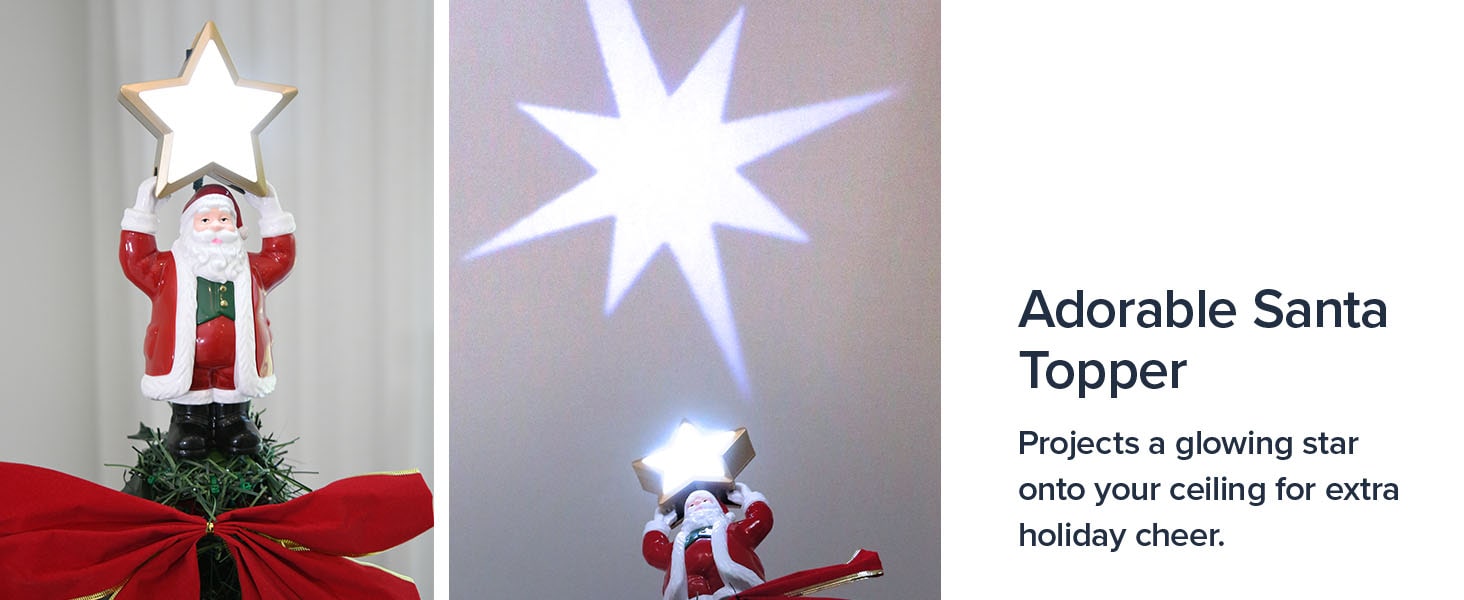 - UNIQUE SANTA TOPPER WITH STAR PROJECTION: Create a magical holiday ambiance with the one-of-a-kind Santa topper. It features an innovative light projector that casts a radiant North Star onto your ceiling, making your tree stand out